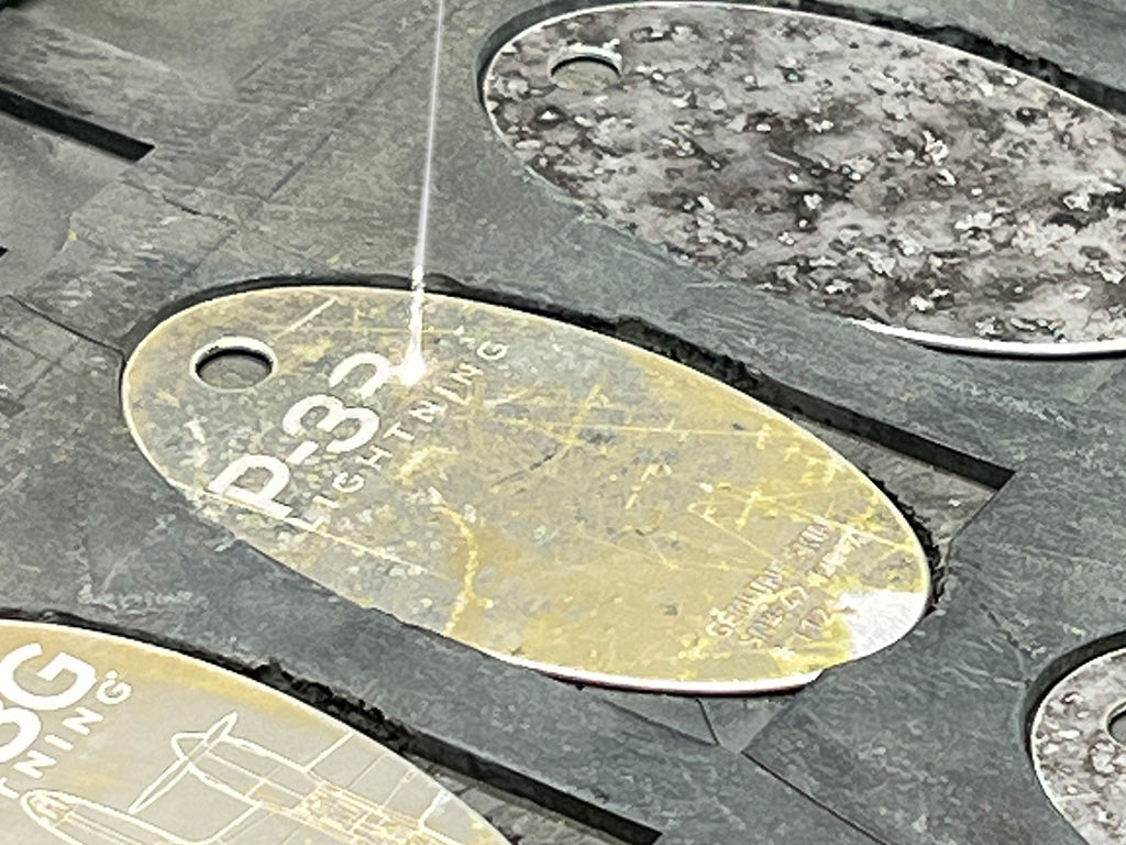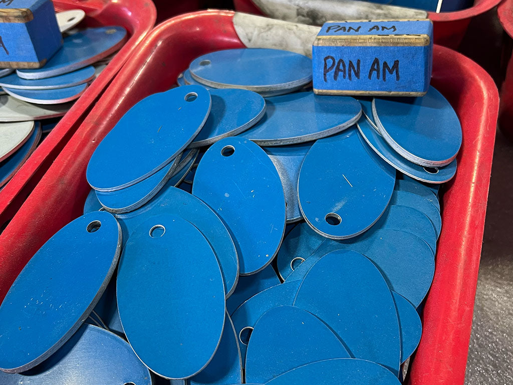 After meticulously cutting large fuselage sections into smaller pieces, we hand-stamp each PlaneTag, creating the iconic oval-shaped mementos cherished by travelers and aviation enthusiasts worldwide. Our process includes cleaning the aircraft skin, removing grime, polishing, sanding, and deburring edges to ensure a smooth feel while preserving the metal's authentic patina. Each PlaneTag is uniquely handcrafted, numbered, and distinct—ensuring that while you share a piece of aviation history, your tag remains uniquely yours.